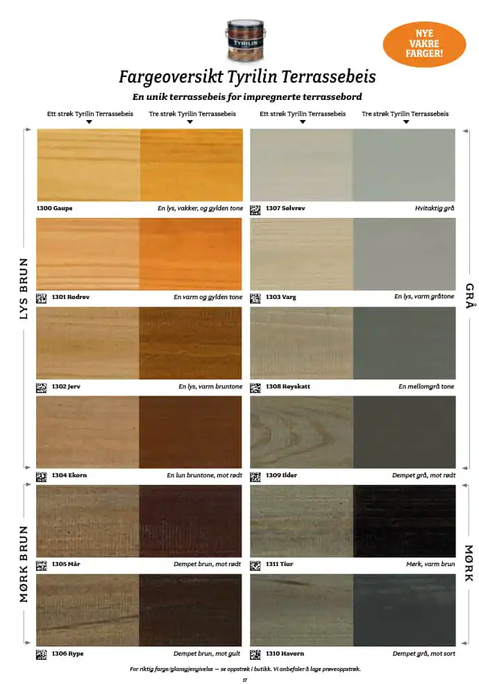 - Deretter vanlig vedlikehold med vasking og ett strøk TYRILIN Terrassebeis. Behandle 3–4 bord i hele lengden av gangen.